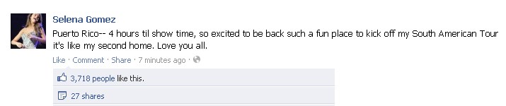 «Puerto Rico– 4 hours til show time, so excited to be back such a fun place to kick off my South American Tour it’s like my second home. Love you all.» (Puerto Rico— 4 horas hasta que comience la función, estoy tan emocionada de haber regresado a un lugar tan divertido para comenzar mi gira sur americana. es como mi segundo hogar. los amo.») – Dijo la cantante en su facebook oficial.
