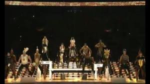 Se hizo la luz en el enorme escenario cuando Madonna fue cargada y escoltada sentada en un trono al estilo de las reinas egipcias por soldados romanos/espartanos que anunciaban su llegada con trompetas en el espectáculo de medio tiempo del Super Bowl/Súper Tazón.