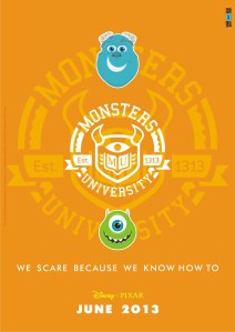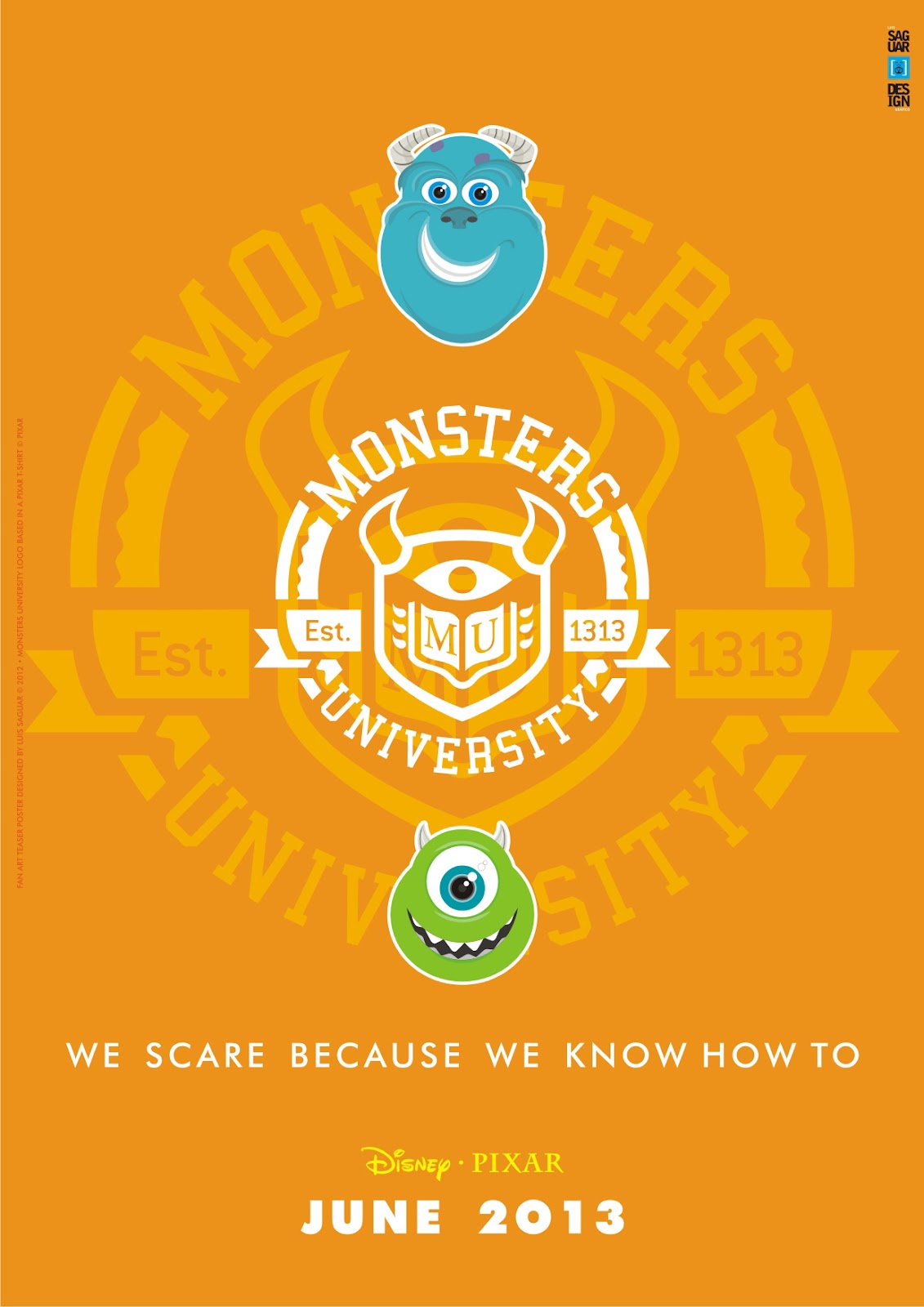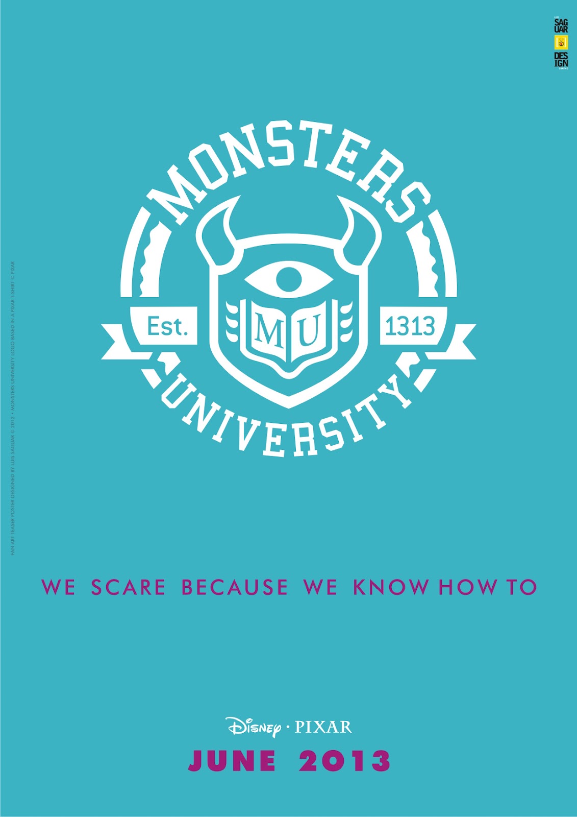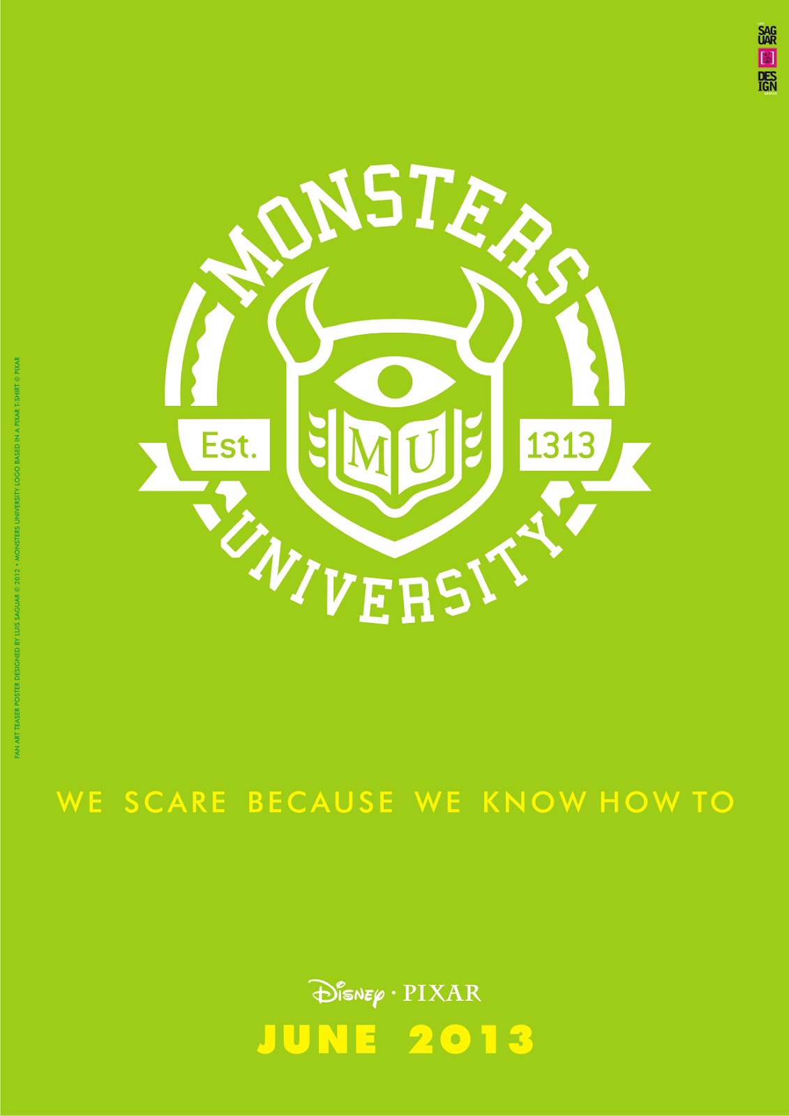 «Hace dos semanas, visitando el blog Rincón de Pixar , me encontré con una foto donde un miembro del personal llevaba una camiseta del equipo de estudio de California la producción de los monstruos de la Universidad. Como un ejercicio decidí volver a dibujar el símbolo impreso en la camiseta y hacer una serie de tres carteles teaser de la película animada.»