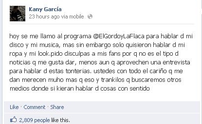 “hoy se me llamo al programa @ElGordoyLaFlaca para hablar d mi disco y mi musica, mas sin embargo solo quisieron hablar d mi ropa y mi look.pido disculpas a mis fans por q no es el tipo d noticias q me gusta dar, menos aun q aprovechen una entrevista para hablar d estas tonterias. ustedes con todo el cariño q me dan merecen muho mas q eso y trankilos q buscaremos otros medios donde si kieran hablar d cosas con sentido” – expresó la cantante a través de una actualización llena de errores ortográficos en su fan page de Facebook.