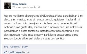 La cantante puertorriqueña Kany García arremetió ayer a través de su twitter y facebook contra el programa de farándula El Gordo y la Flaca de Univision por estar comentando sobre su “Look” y su vestimenta en vez de hablar de su disco y música durante el programa.