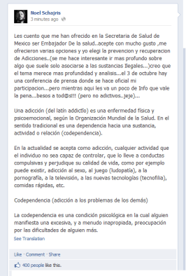 “Les cuento que me han ofrecido en la Secretaria de Salud de Mexico ser Embajador De la salud..acepte con mucho gusto ,me ofrecieron varias opciones y yo elegi la prevencion y recuperacion de Adicciones..(se me hace interesante ir mas profundo sobre algo que suele solo asociarse a las sustancias Ilegales…)creo que el tema merece mas profundidad y analisis…el 3 de octubre hay una conferencia de prensa donde se hace oficial mi participacion…pero mientras aqui les va un poco de Info que vale la pena…besos a tod@s!!! (pero no adictivos..jeje)…” – Anunció el cantante en su facebook.