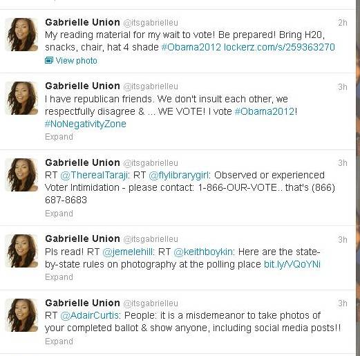 La actriz estadounidense Gabrielle Union compartió un “tweet” de una seguidora que decía que es un delito tomarle fotos a la papeleta electoral, al igual que publicarla en las redes sociales. También dijo que voto por Obama y que tiene amigos republicanos.