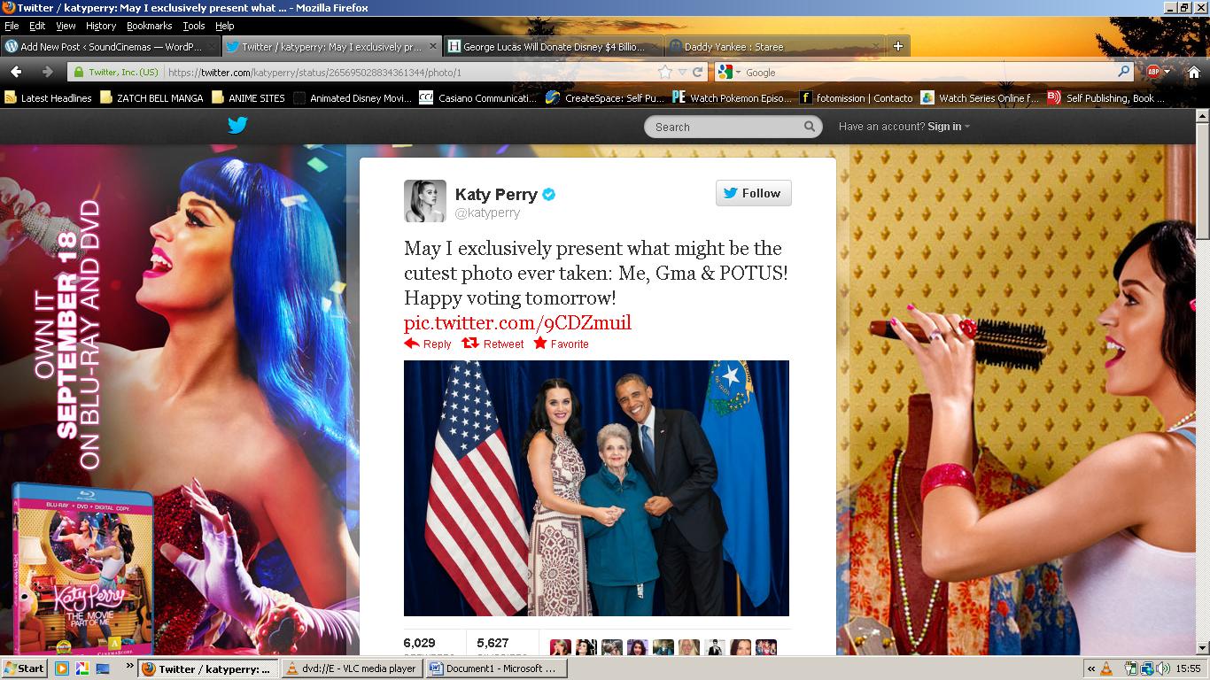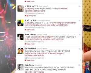 La cantante de música pop Katy Perry publicó ayer una foto de ella junto a su abuela y el presidente de los Estados Unidos: Barack Obama. El día de hoy a compartido los “Tweets” de sus fans que comentan que fueron a votar o como fueron vestidos para votar.