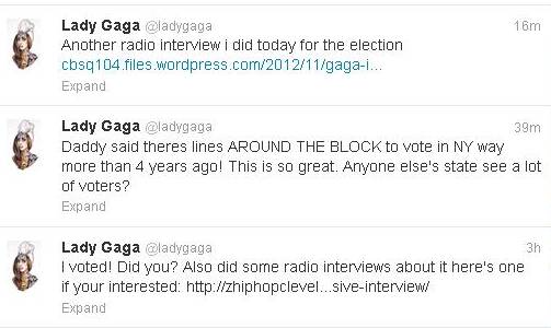 La cantante Lady GaGa expresó a su fanaticada en twitter que ella ya votó y le preguntó a sus fans si habían hecho lo mismo. Y compartió un enlace sobre una entrevista radial que le hicieron sobre el tema.