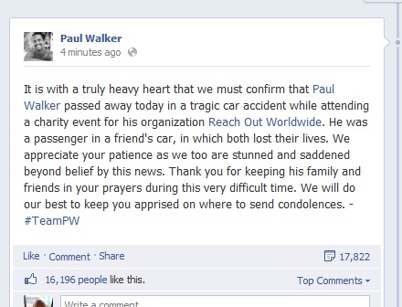 «Es con una gran peso en el corazón que debemos confirmar que Paul Walker falleció hoy en un trágico accidente de transito mientras atendía un evento de caridad para su organización «Reach out Worldwide» El era el pasajero en un carro de un amigo en el cual ambos perdieron sus vidas….»