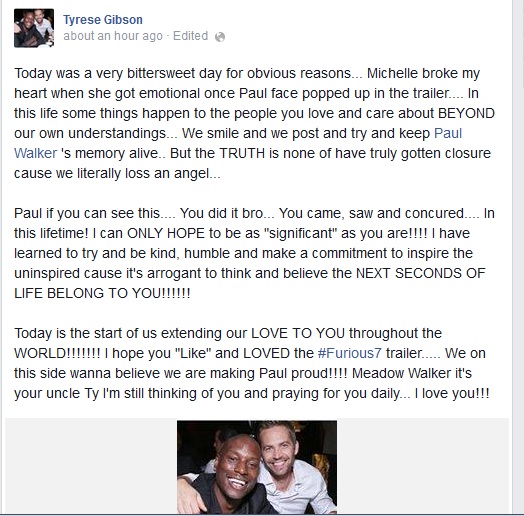 Tyrese, encarnó a Roman «Rome» Pearce en 2 Fast 2 Furious, Fast Five y Fast & Furious 6, le dedicó el mensaje inspirado en el lanzamiento del trailer de Furious 7.