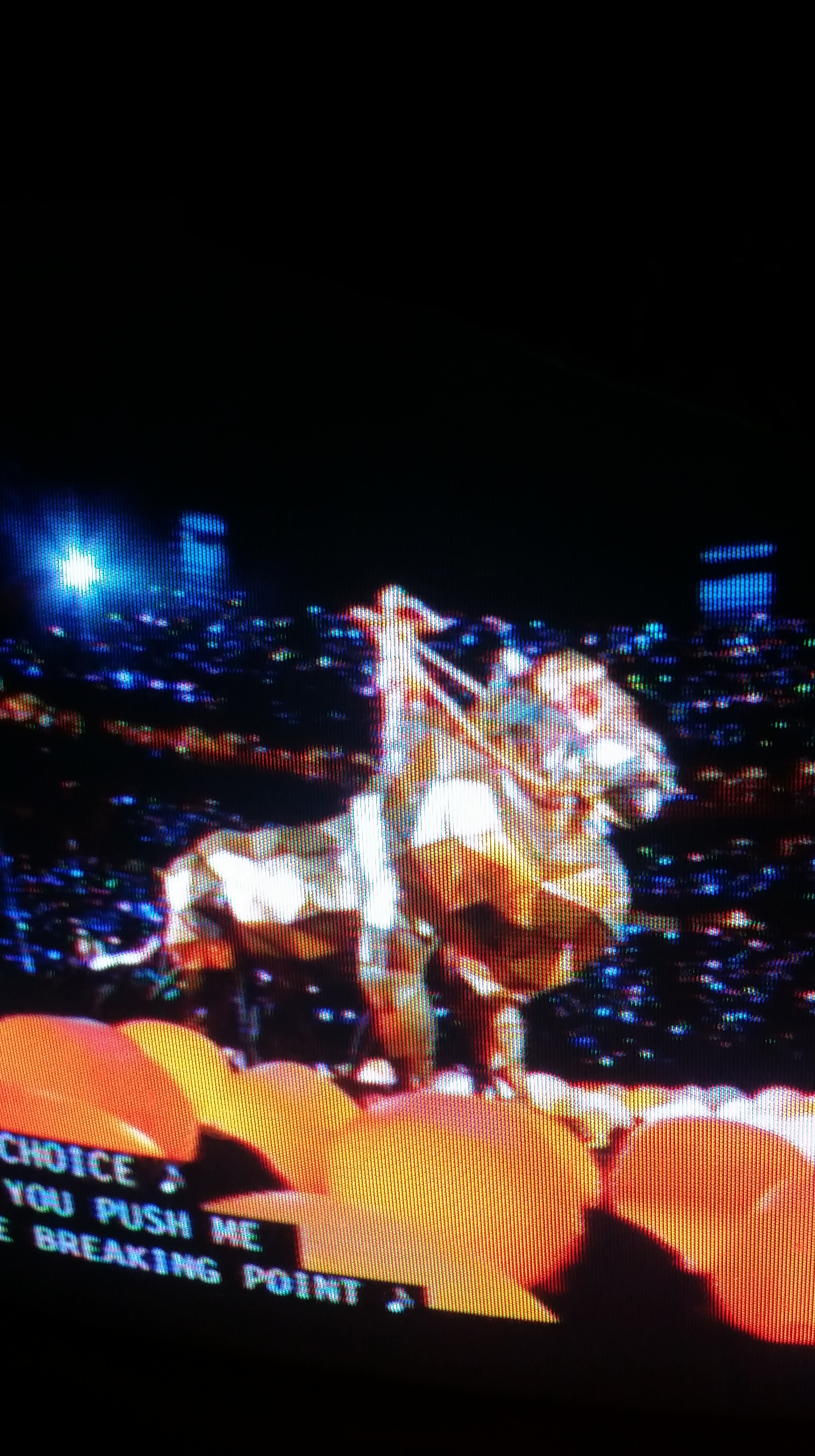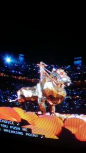 Después de una breve interpretación del tema, el estadio se oscureció y se vuelve a iluminar con unos bailarines vestidos de ajedrez mientras ella interpreta «Dark Horse»