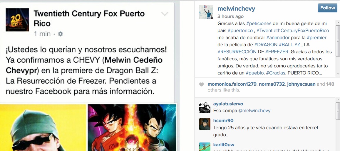 «Ustedes lo querían y nosotros escuchamos! Ya confirmamos a CHEVY (Melwin Cedeño Chevypr) en la premiere de Dragon Ball Z: La Resurrección de Freezer. Pendientes a nuestro Facebook para más información.» – Anunció Fox Puerto Rico en su cuenta de Facebook oficial.