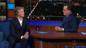 El ex vocalista de «Los Beatles» Paul McCartney (Izq) habla con Stephen Colbert (Derecha) sobre su relacion con su fenecido ex compañero de banda John Lennon.