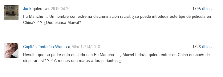 Otros comentarios se enfocan en el personaje Fu Manchu (padre de Shang Chi en las comic del personaje) » Fu Manchu … Un nombre con extrema discriminación racial, ¿se puede introducir este tipo de película en China? ? ? ¿Qué piensa Marvel?»