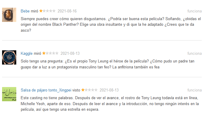 La película del Universo Cinematográfico de Marvel (UCM) Shang-Chi’ ha sido fuertemente criticada en China. En la red social Douban, algunos comentarios dicen «¿olvidas el origen del nombre Black Panther? Elige una obra insultante y di que la he adaptado ¿Crees que te da asco?» «Solo tengo una pregunta: ¿Es el propio Tony Leung el héroe de la película? ¿Cómo pudo un padre tan guapo dar a luz a un protagonista masculino tan feo? La anfitriona también es fea»
